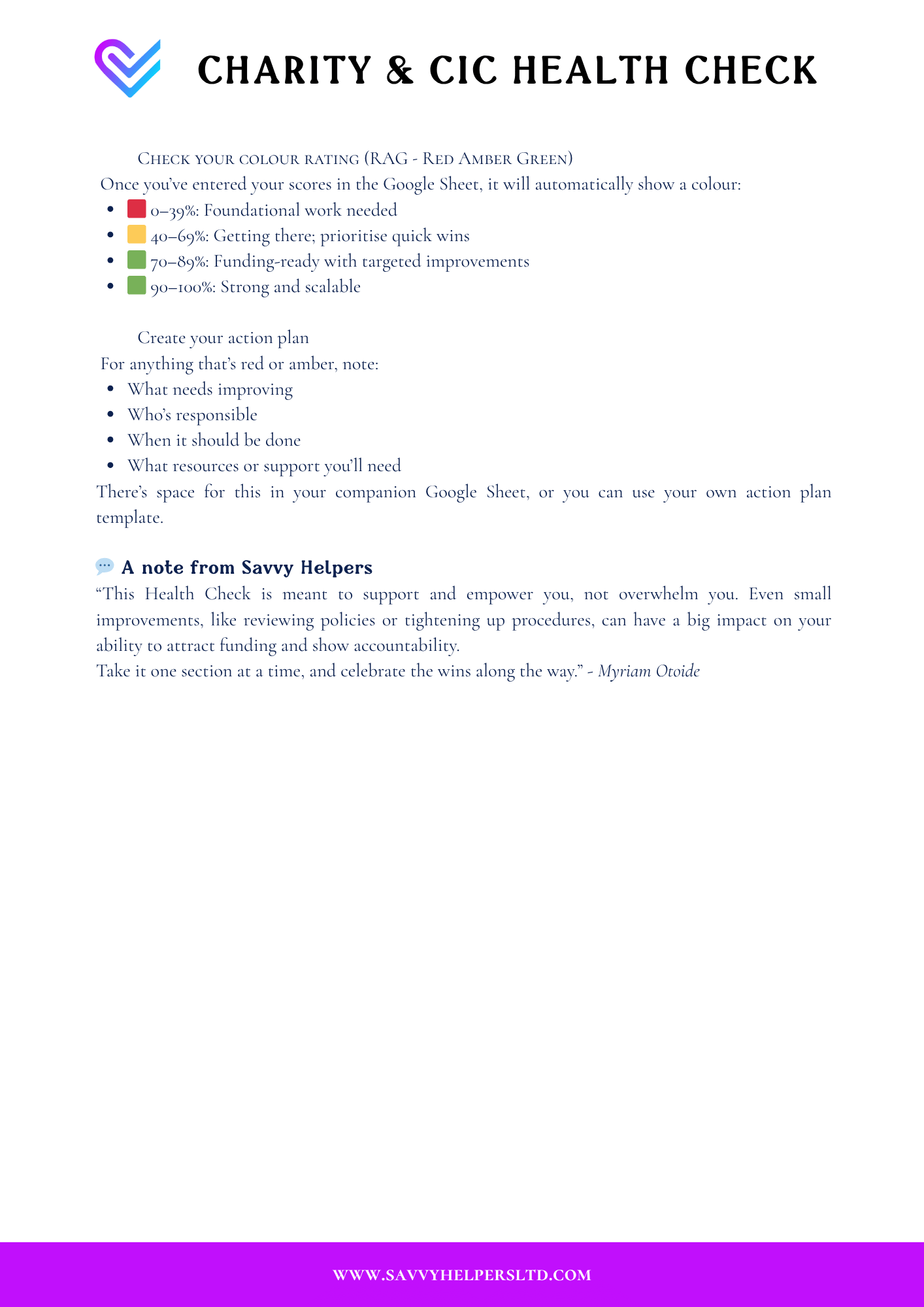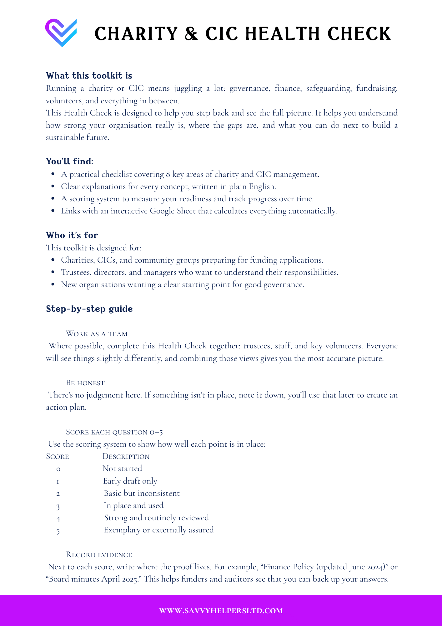 Small charities, CICs and community groups that want a clear, professional way to check systems, strengthen governance and prepare for funding.