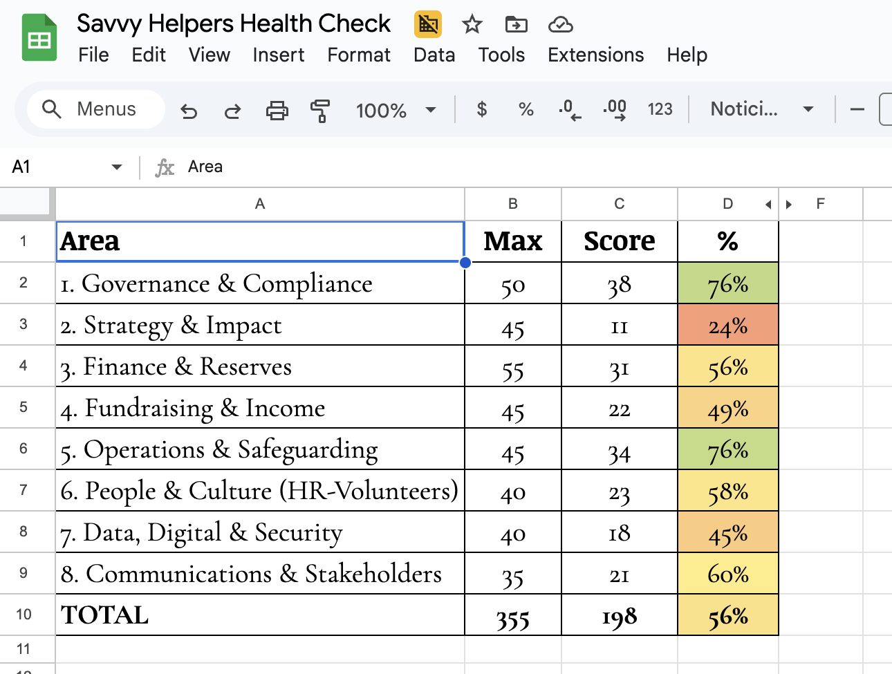 • Interactive scoring workbook (Google Sheets) — enter 0–5 and get instant totals, section % and overall readiness
